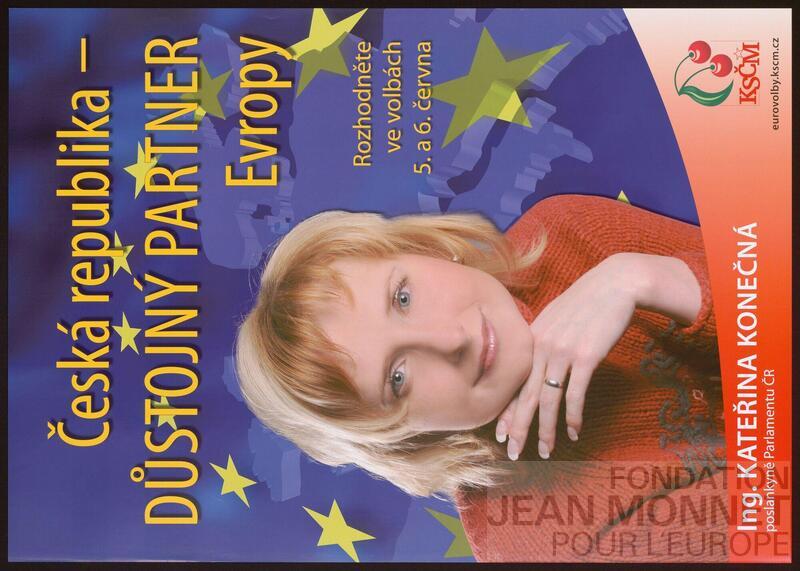 Le Parti communiste de Bohême et Moravie (KSČM) est un parti politique tchèque d'extrême-gauche. Kateřina Konečná est une femme politique tchèque, députée européenne. On retrouve Kateřina Konečná sur l'affiche qui présente tous les candidats aux élections européennes (C02-0195), dont certains ont été élus en 2004, date retenue pour cette affiche (source: Wikipédia, consulté en ligne le 4 juin 2025). On retrouve la même ligne graphique sur les affiches C02-0187, C02-0188, C02-1089, C02-0190, C02-0191, C02-0192, C02-0193, C02-0194 et C02-0195.