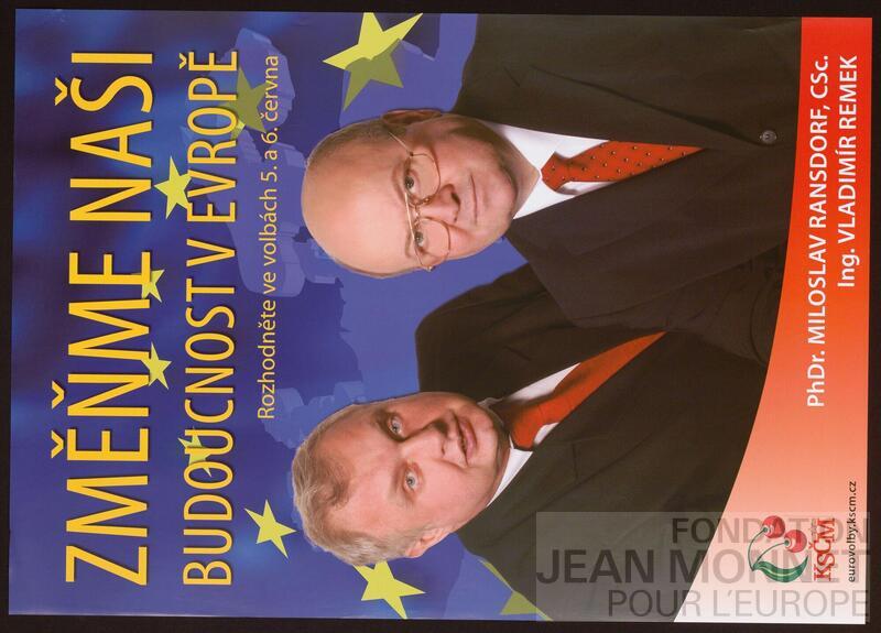 Le Parti communiste de Bohême et Moravie (KSČM) est un parti politique tchèque d'extrême-gauche. Miloslav Ransdorf est un homme politique tchèque, député européen. Vladimír Remek est un homme politique tchèque élu député européen en 2004, date retenue pour cette affiche (source: Wikipédia, consulté en ligne le 5 juin 2025). On retrouve la même ligne graphique sur les affiches C02-0187, C02-0188, C02-1089, C02-0190, C02-0191, C02-0192, C02-0193, C02-0194 et C02-0195.