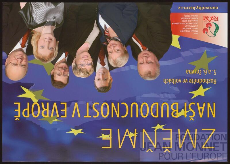 Le Parti communiste de Bohême et Moravie (KSČM) est un parti politique tchèque d'extrême-gauche. Miloslav Ransdorf, Věra Flasarová, Jiří Maštálka, Zuzka Bebarová-Rujbrová, Jaromír Kohlíček, Kateřina Konečná et Vladimír Remek sont tous des personnages politiques tchèque députés euopéens, dont certains ont été élu en 2004, date retenue pour cette affiche (source: Wikipédia, consulté en ligne le 5 juin 2025). On retrouve la même ligne graphique sur les affiches C02-0187, C02-0188, C02-1089, C02-0190, C02-0191, C02-0192, C02-0193, C02-0194 et C02-0195.