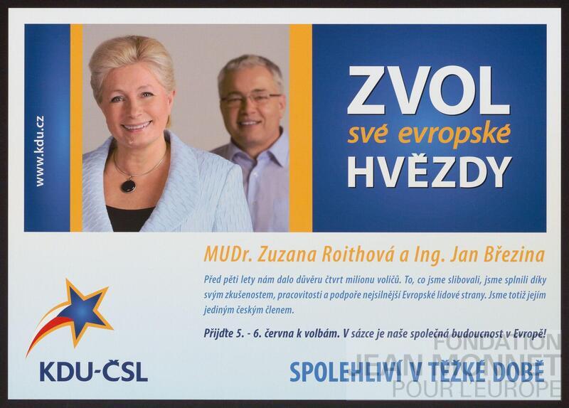 Zuzana Roithová et Jan Březina ont tous les deux été députés européens de 2004 à 2014 (sources: Wikipédia, consulté en ligne le 5 juin 2025 et https://www.kdu.cz/getattachment/bebe8904-ef19-4a5a-8054-e967abbd909d/program.aspx, consulté en ligne le 18 juin 2025). On retrouve la même ligne graphique sur l'affiche C02-0196. Douclon avec l'affiche C02-0199
