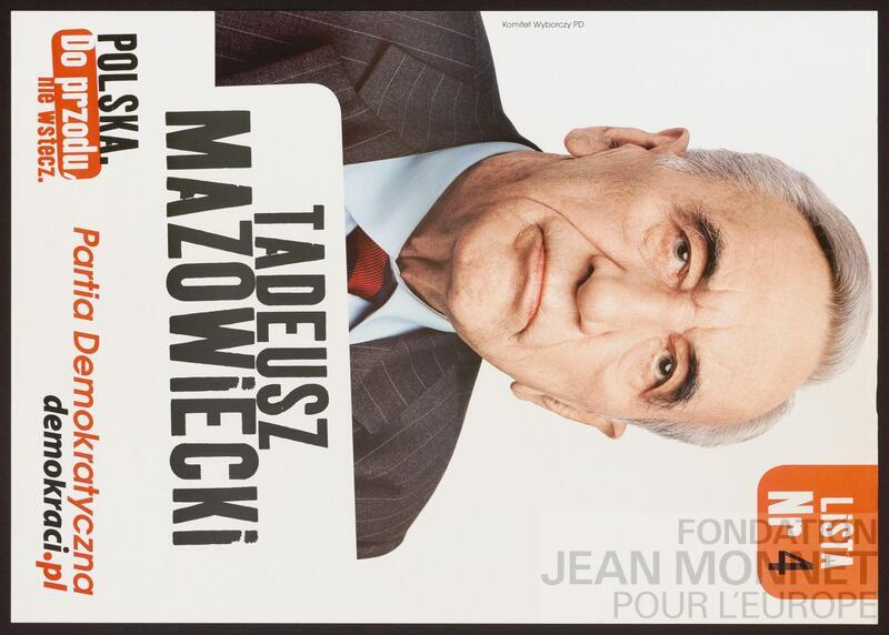 Affiche électorale du Parti démocratique polonais. La date retenue correspond à la candidature de Tadeusz Mazowiecki, membre fondateur du Parti démocratique polonais qu'il quitte en 2006 (source: Wikipédia, consulté en ligne le 01 juillet 2025)