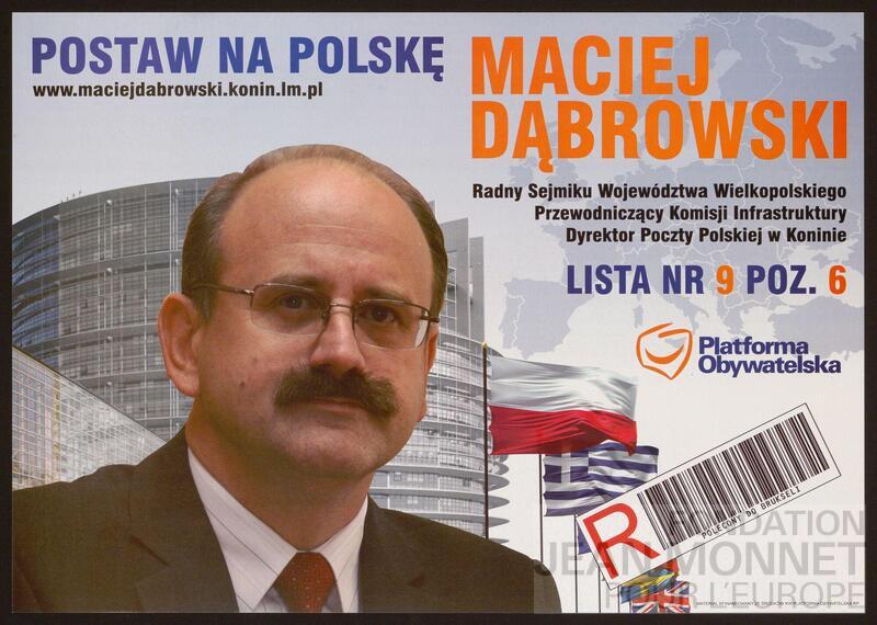 L'affiche présente la photographie de Maciej Dąbrowski qui se tient devant le Parlement européen.