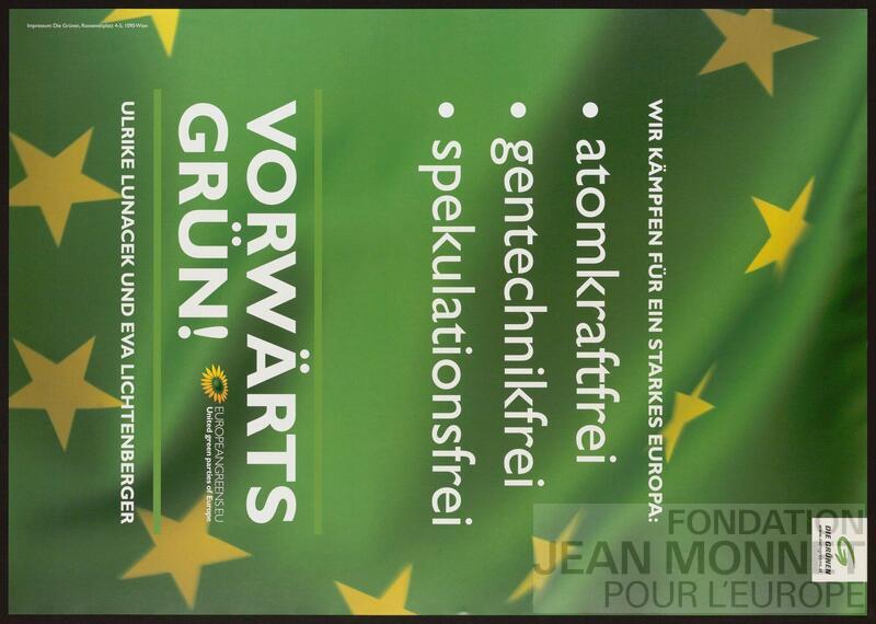 "Affiche des Verts allemands à l'occasion de la campagne européenne de 2009 On retrouve les mentions d'Ulrike Lunacek et Eva Lichtenberger sur les affiches C02-0231, C02-0232 et C02-0233. Ulrike lunacek et Eva lichtenberger se sont présentées aux élections européennes de 2009, date retenue pour cette affiche (sources: https://www.derstandard.at/story/1237230185507/gruene-ulrike-fuehrt-das-volk-an, consulté en ligne le 23 juin 2025 et https://www.oe24.at/oesterreich/politik/gruene-als-pro-europa-partei/516030, consulté en ligne le 23 juin 2025)." "Impressum: die Grüne On retrouve la même ligne graphique que sur l'affiche C02-0232."