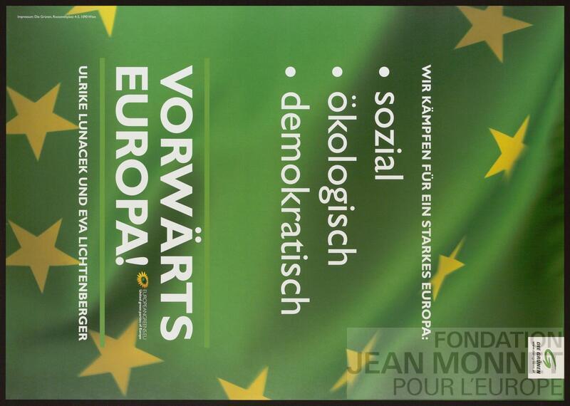 "Affiche des Verts allemands à l'occasion de la campagne européenne de 2009 On retrouve les mentions d'Ulrike Lunacek et Eva Lichtenberger sur les affiches C02-0231, C02-0232 et C02-0233. Ulrike lunacek et Eva lichtenberger se sont présentées aux élections européennes de 2009, date retenue pour cette affiche (sources: https://www.derstandard.at/story/1237230185507/gruene-ulrike-fuehrt-das-volk-an, consulté en ligne le 23 juin 2025 et https://www.oe24.at/oesterreich/politik/gruene-als-pro-europa-partei/516030, consulté en ligne le 23 juin 2025)." "Impressum: die Grüne On retrouve la même ligne graphique que sur l'affiche C02-0231."