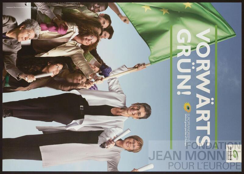 "Affiche des Verts allemands à l'occasion de la campagne européenne de 2009 On retrouve les mentions d'Ulrike Lunacek et Eva Lichtenberger sur les affiches C02-0231, C02-0232 et C02-0233. Ulrike lunacek et Eva lichtenberger se sont présentées aux élections européennes de 2009, date retenue pour cette affiche (sources: https://www.derstandard.at/story/1237230185507/gruene-ulrike-fuehrt-das-volk-an, consulté en ligne le 23 juin 2025 et https://www.oe24.at/oesterreich/politik/gruene-als-pro-europa-partei/516030, consulté en ligne le 23 juin 2025)." Impressum: die Grüne
