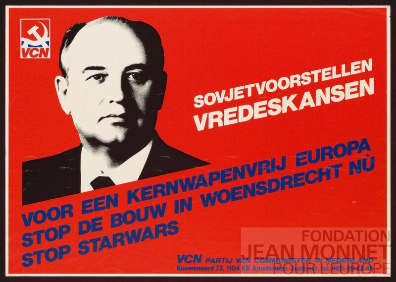 Affiche du Parti communiste des Pays-Bas. Les dates extrêmes retenues correspondent à l'instalation de missiles durant la "crise des euromissiles" à la base Woensdrecht entre 1987 et 1988, ainsi qu'aux oppositions de la société civile en 1984 (source: Wikipédia, consulté en ligne le 01 juillet 2025)