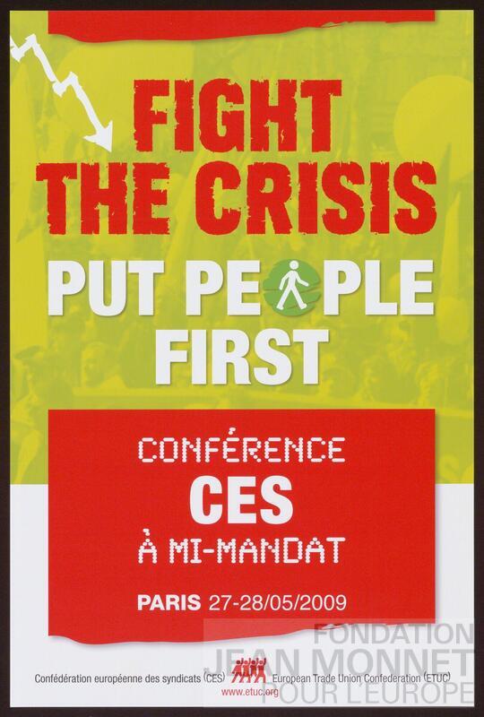 Affiche de la Confédération européenne des syndicats (CES, ETUC) à l'occasion d'une conférence ayant lieu les 27 et 28 mai 2009 à Paris. On retrouve le même titre sur l'affiche C03-0013.