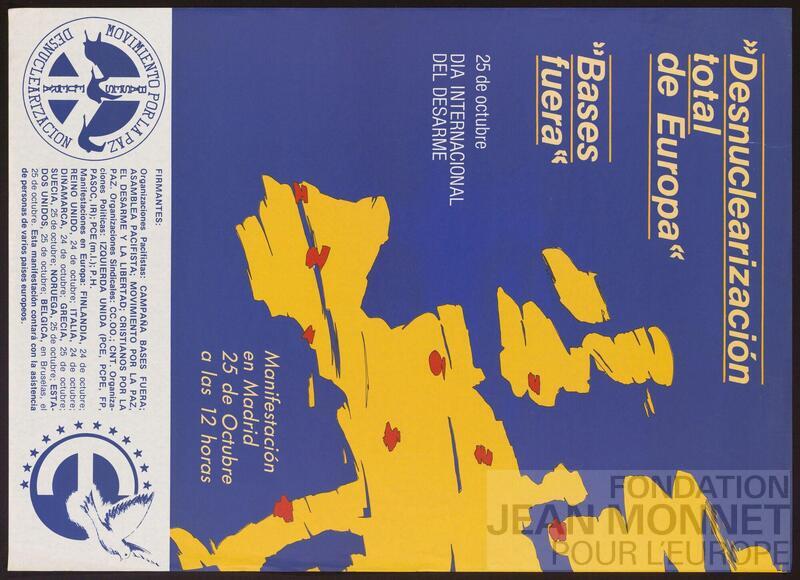 Affiche de l'ONG espagnole Movimiento por la paz, mouvement pour le dénucléarisation de l'Europe (source: https://www.mpdl.org/, consulté en ligne le 24 juin 2025), à l'occasion de la semaine internationale du désarmement (source: https://www.un.org/fr/observances/disarmament-week, consulté en ligne le 30 juin 2025).