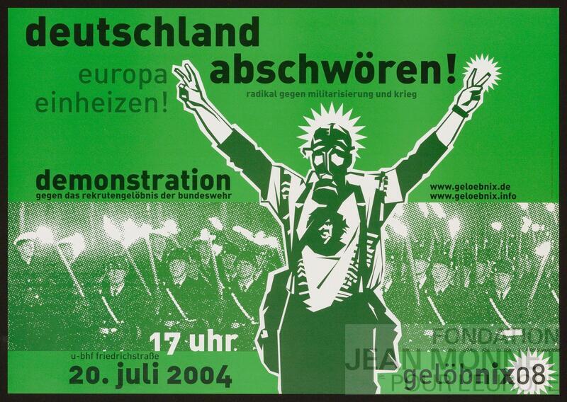 Affiche d'un groupe d'extrême gauche faisant partie du mouvement Gelöbnix à l'occasion d'une manifestation contre la prestation de serment des recrues de la Bundeswehr (source: Wikipédia, consulté en ligne le 26 juin 2025)