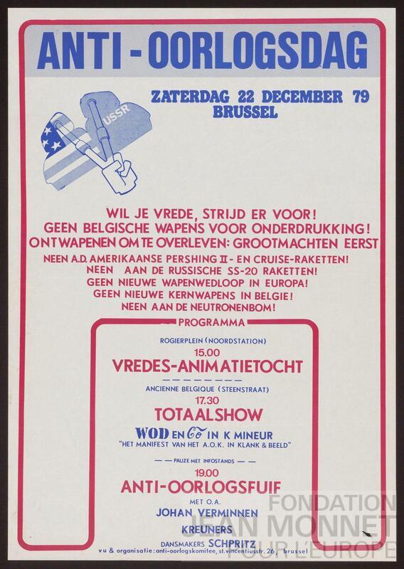 Affiche d'annonce du programme de la journée contre la guerre ayant lieu le 22 décembre 1979 à Bruxelles organisée par le comité anti-guerre belge