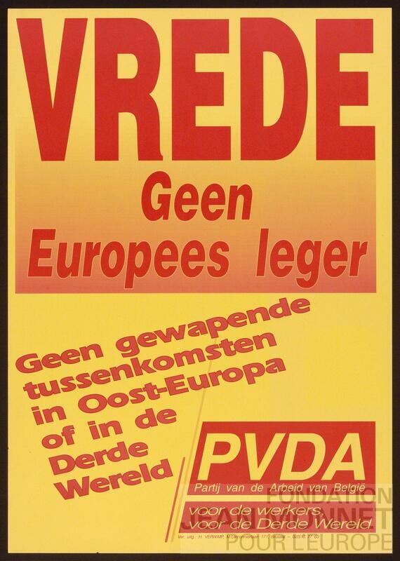 Affiche du Parti du travail de Belgique (PVDA). On trouve l'inscription "Ver. Uitg.: H. Verwimp, M. Lemonnierlaan" sur l'affiche.