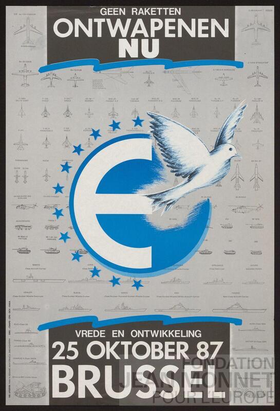 L'affiche présente une colombe qui s'envole du signe de l'euro. On y trouve aussi des étoiles bleues et des dessins de missiles, d'avions, d'hélicoptères, de bateaux et de chars d'assaut.