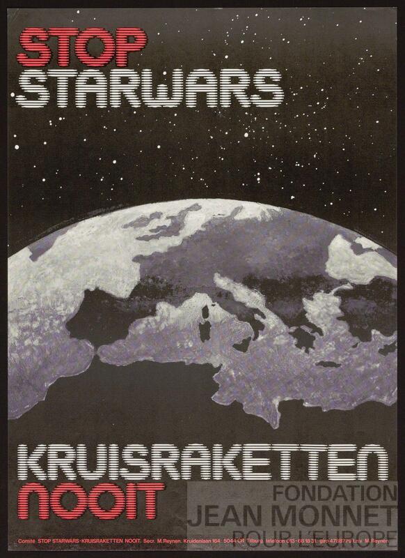 Affiche du Comité néerlandais Stop starwars - kruisraketten nooit. On trouve l'inscription "t.n.v.: M. Reynen" sur l'affiche. Les dates extrêmes correspondent au lancement et la fin du programme "Strategic Defense Initiative" dont le surmon est "Star Wars"