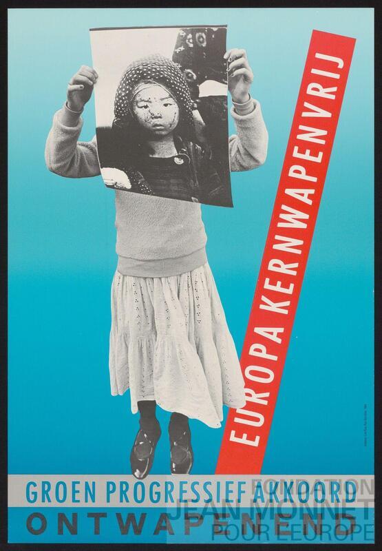 L'affiche présente une petite fille qui tient devant sa tête la photographie d'une autre petite fille. On trouve aussi une banderole rouge sur laquelle est écrit "Europa kernwapenvrij".