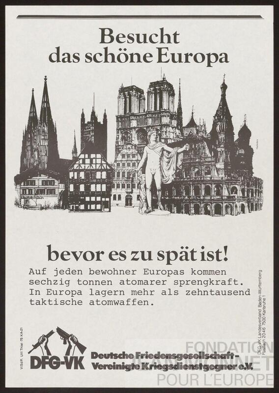 L'affiche présente plusieurs monuments européens (Notre-Dame de Paris, Le Colisée de Rome, etc.) ainsi qu'un texte sur les armes nucléaires européennes ("Auf jeden bewohner Europas kommen sechzig tonnen atomarer sprengkraft. In Europa lagern mehr als zehntausend taktische atomwaffen.")