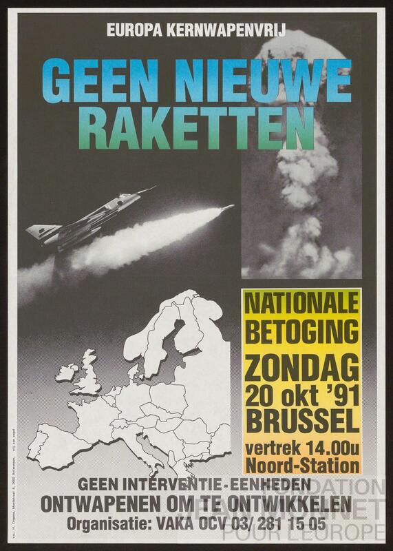 Affiche du Comité d'action flamand contre les armes atomiques (VAKA) à l'occasion d'une manifestation ayant lieu le 20 octobre 1991 à Bruxelles. Editeur responsable: H. Ongena