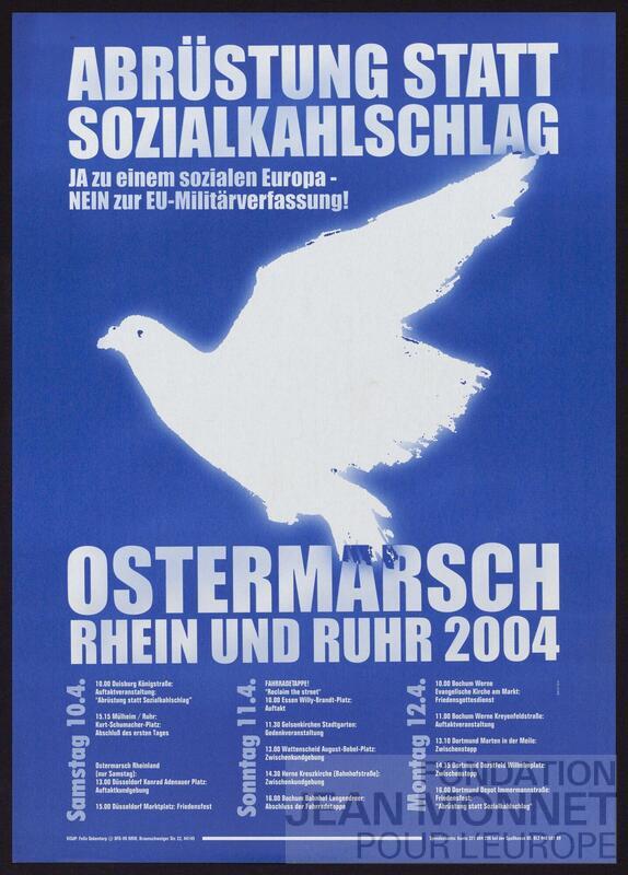 Affiche d'annonce de la marche de Pâques ayant lieu en Allemagne en 2004. Responsable au sens du droit de la presse (V.i.S.d.P en allemand): Felix Dekentorp