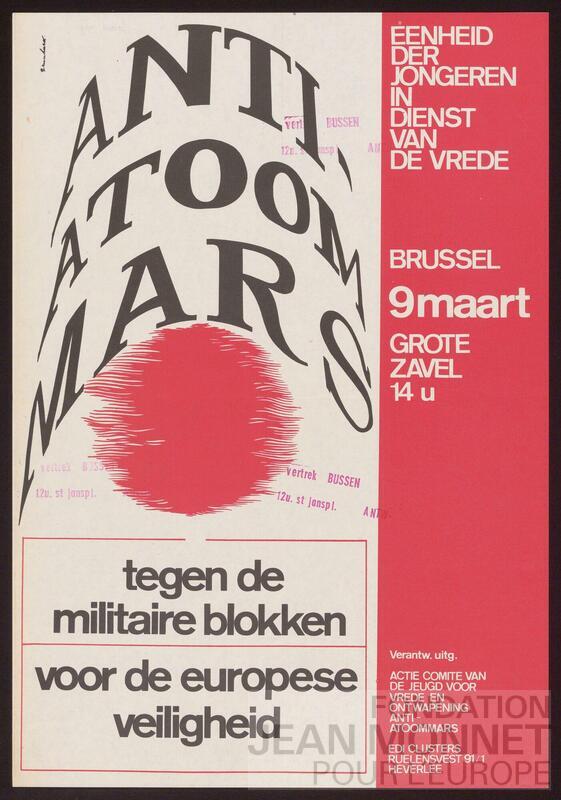Affiche du comité d'action de la jeunesse pour la paix et le désarmement néerlandais à l'occasion d'une marche anit-nucléaire ayant lieu à Bruxelles. Les dates extrêmes retenues correspondent à la crise des euromissiles (source: Wikipédia, consulté en ligne le 21 juillet 2025)