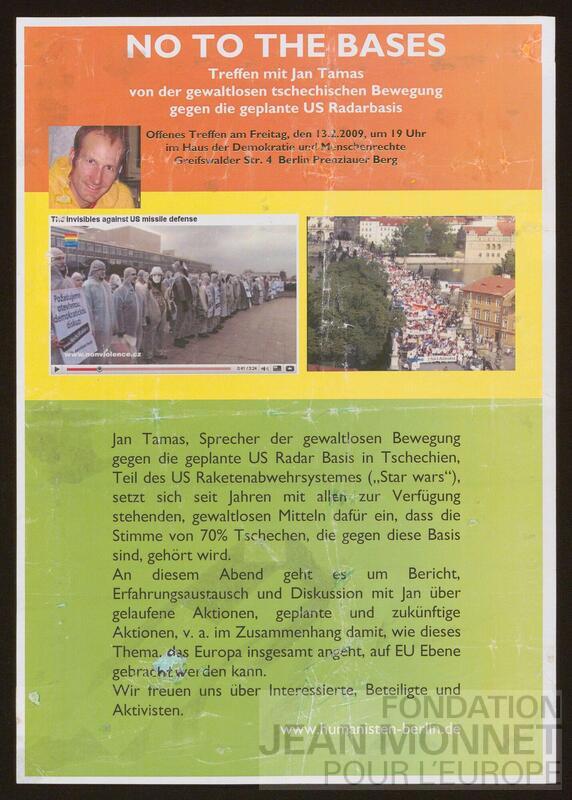 Affiche d'annonce de rencontre avec Jan Tamas du mouvement non-violent tchèque contre le projet de base radar américaine