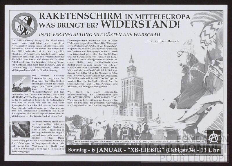 Affiche du collectif XB-Liebig (en lien avec le squat emblématique situé dans le quartier de Friedrichshain à Berlin et plus précisemment à Liebigstrasse 14). Les dates extrêmes retenues correspondent à l'annonce et au retrait du programme de missiles dans la base polonaise de Redzikowo (source: Wikipédia, consulté en ligne le 21 juillet 2025)