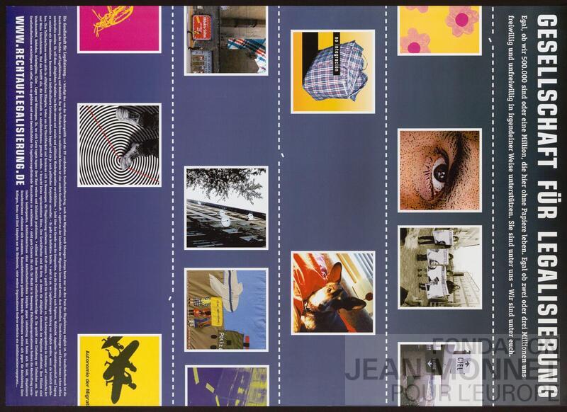 Affiche de la société pour la légalisation allemande au sujet de la reconnaissance du droit à la régularisation et à la mobilité (source: http://rechtauflegalisierung.kanak-attak.de/aktuell/gfl.html, consulté en ligne le 1 juillet 2025). Responsable au sens du droit de la presse (V.i.S.d.P en allemand): Anna Artur