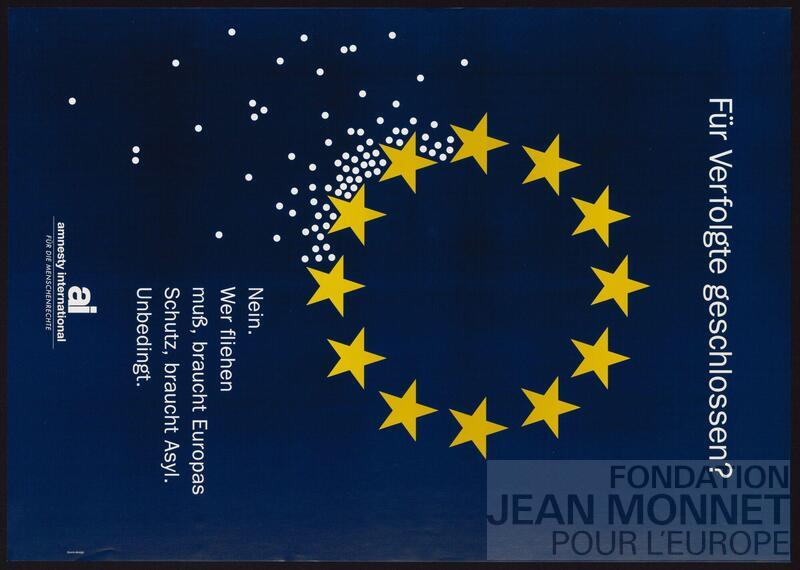 L'affiche présente le drapeau de l'Europe ainsi que le texte "Nein. Wer fliehen muss, braucht Europa Schutz, braucht Asyl. Unbedingt.".