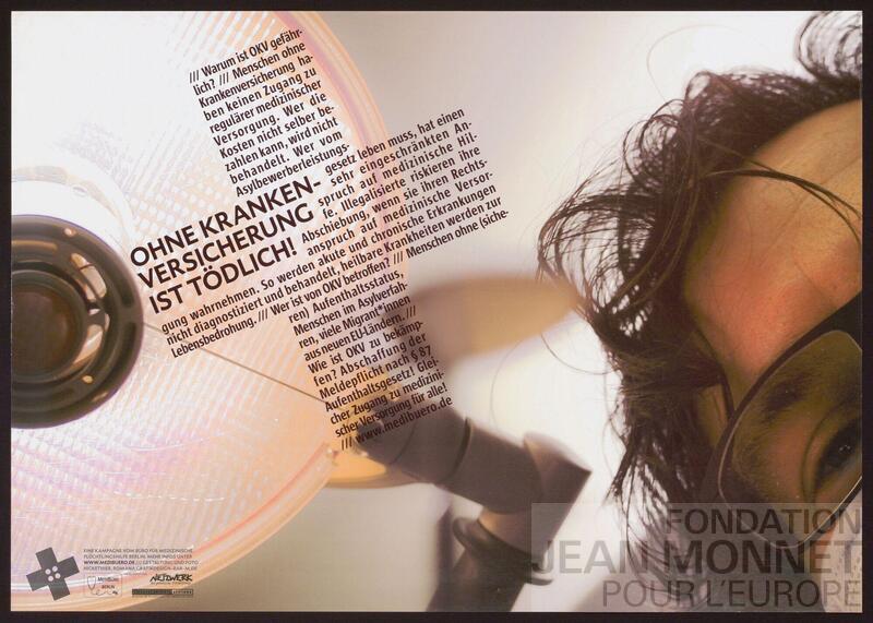 Affiche de MediBüro (organisation qui lutte pour l'accès aux soins pour tous) à l'occasion d'une campagne ayant eu lieu entre 2013 et 2014, dates extrêmes retenues pour cette affiche. Source pour les dates: https://medibuero.de/okv-ist-toedlich/, consulté en ligne le 2 juillet 2025. On retrouve la même ligne graphique sur les affiches C03-0141, C03-0142 et C03-0143.