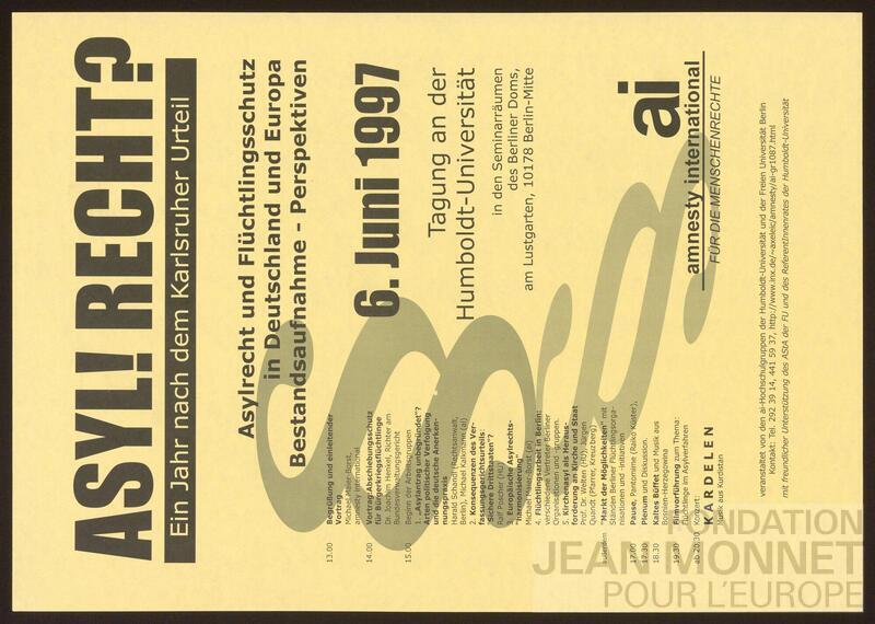 Affiche d'annonce d'un colloque organisé par Amnesty International sur le droit d'asile et la protection des réfugiés en Allemagne et en Europe