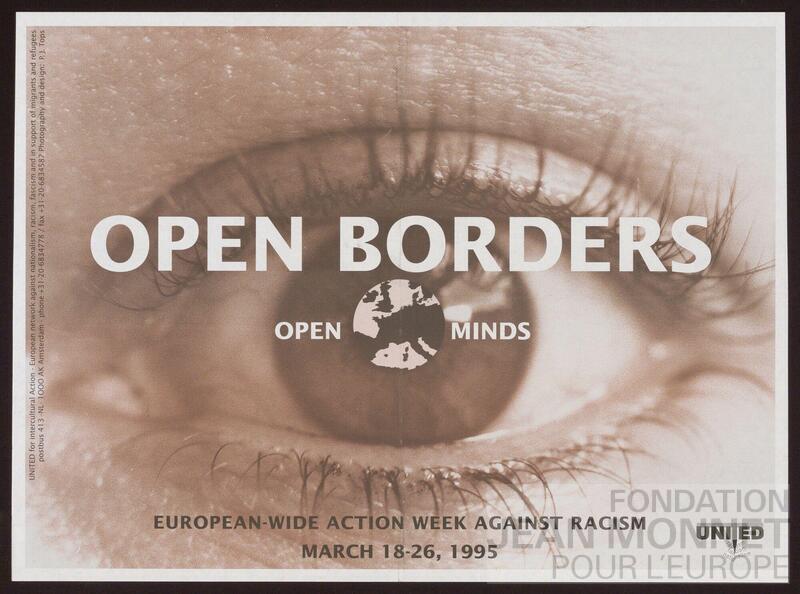 Affiche du réseau européen de lutte contre le nationalisme, le racisme et le fascisme et de soutien aux migrants et aux réfugiés UNITED for intercultural Action à l'occasion de la semaine européenne d'action contre le racisme (source: https://unitedfia.org/, consulté en ligne le 8 juillet 2025)