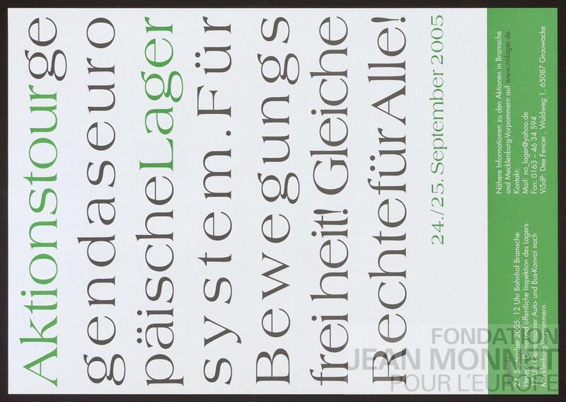 Affiche à l'occasion de la tournée d'action contre le système européen des camps d'hébérgement des réfugiés et des migrants ayant lieu les 24 et 25 septembre 2005. Responsable au sens du droit de la presse (V.i.S.d.P en allemand): Dee Fencer