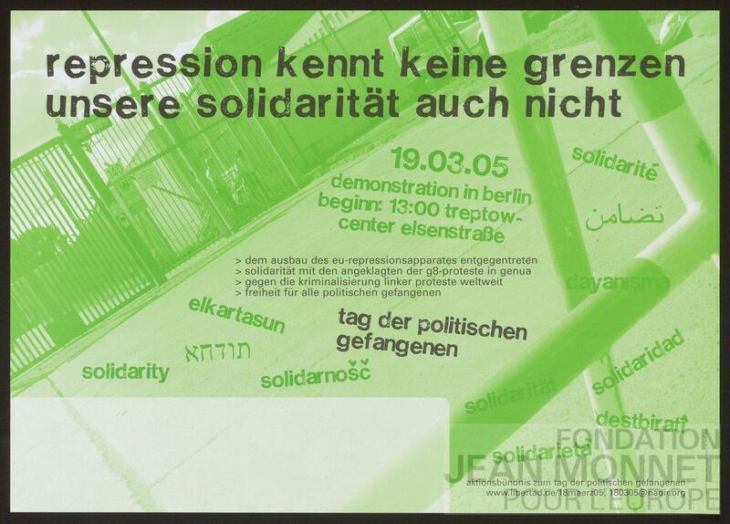 Affiche de l'alliance d'action pour la journée des prisonniers politiques (Aktionsbündnis zum Tag der politischen Gefangenen) à l'occasion d'une manifestation ayant lieu le 19 mars 2005 à Berlin