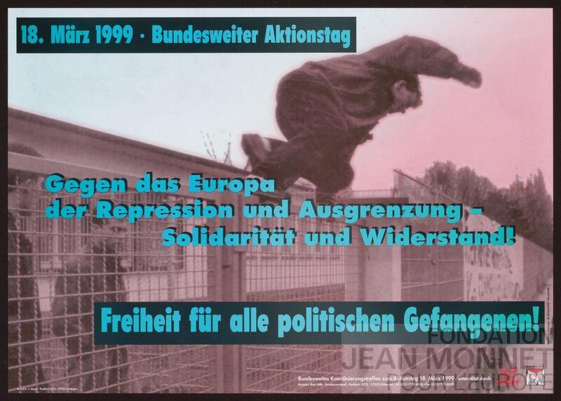 Affiche d'annonce de la réunion de coordination nationale pour la journée d'action (Bundesweites Koordinierungstreffen zum Aktionstag) en lien avec la lutte pour la libération des prisonniers politiques ayant lieu le 18 mars 1999. Responsable au sens du droit de la presse (V.i.S.d.P en allemand): J. Steyer