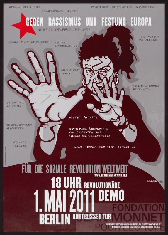 Affiche d'annonce de manifestation, en lien avec la lutte contre le racisme et l'exclusion des immigrés, ayant lieu le 1er mai 2011 à Berlin