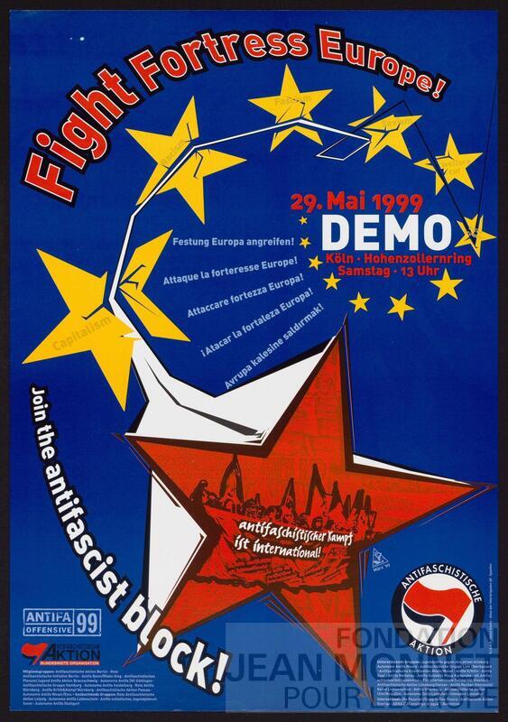 Affiche de l'organisation d'extrême gauche Antifaschistische Aktion à l'occasion d'une manifestation ayant lieu le 29 mai 1999 (source: Wikipédia, consulté en ligne le 8 juillet 2025). Responsable au sens du droit de la presse (V.i.S.d.P en allemand): Heinz Kiwitz