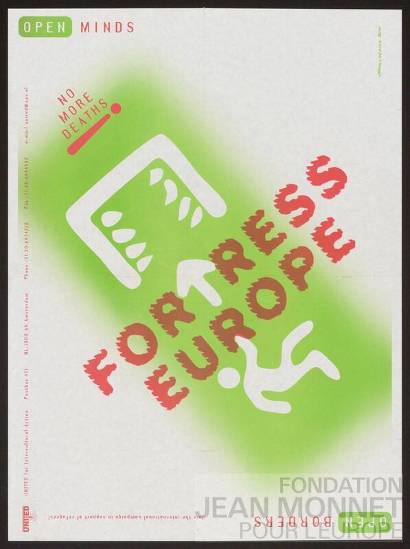 Affiche du réseau européen de lutte contre le nationalisme, le racisme et le fascisme et de soutien aux migrants et aux réfugiés UNITED for intercultural Action à l'occasion d'une campagne pour soutenir les réfugiés (source: https://unitedfia.org/, consulté en ligne le 8 juillet 2025)