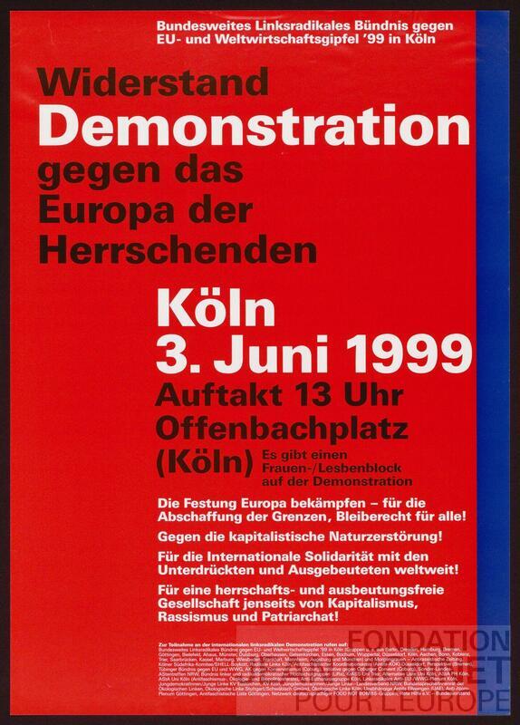 Affiche de l'alliance fédérale de la gauche radicale (Bundesweites Linksradikales Bündnis) à l'occasion d'une manifestation de résistance contre l'Europe ayant lieu le 3 juin 1999 à Köln