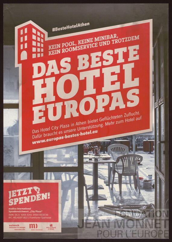Affiche en lien avec le squat de l'hotel "City Plaza" en Grèce lors de la crise des migrants. L'hôtel a été squatté de 2016 à 2019, dates extrêmes retenues pour cette affiche. (source contextuelle et pour les dates: https://best-hotel-in-europe.eu/, consulté en ligne le 14 juillet 2025)