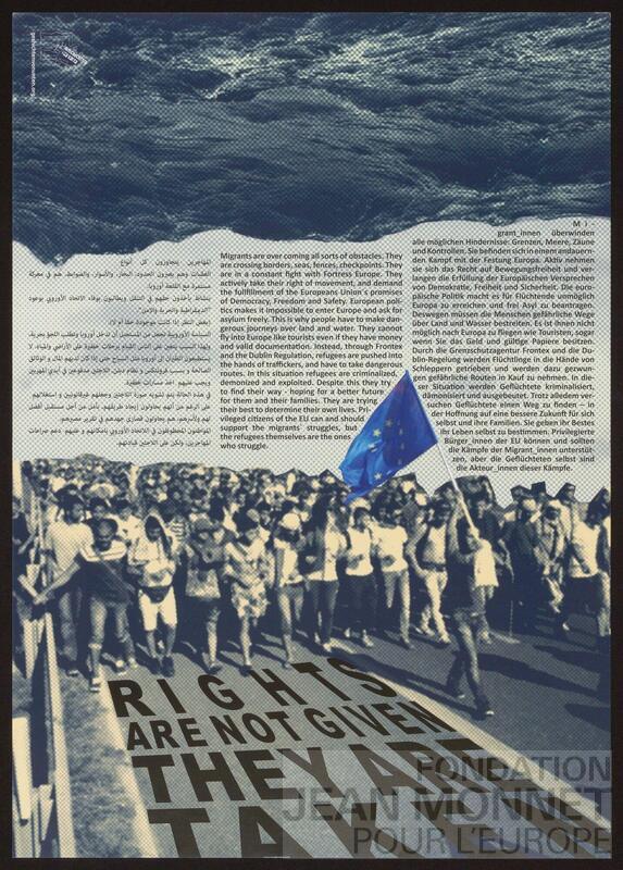 L'affiche présente une photographie de la mer, un long texte sur les conditions d'arrivée des migrants en Europe et une photographie d'une foule de manifestants. Un des manifestant porte le drapeau de l'Europe. Toute l'affiche est recouverte d'un filtre bleu.