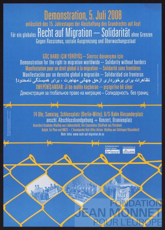 Affiche d'annonce de manifestation pour lutter pour un droit global à la migration. Source complémentaire: http://jogspace.net/files/2014/06/Dokumentation_2008_potsdam.pdf, consulté en ligne le 14 juillet 2025)