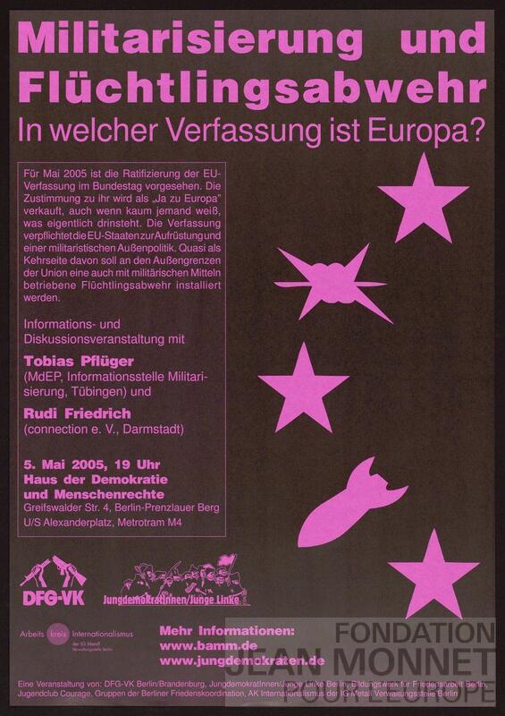 Affiche de l'organisation du mouvement pacifiste allemand DGF-VK à l'occasion d'un événement en lien avec le traitement des réfugiés en Europe qui a lieu le 5 mai 2005 (source: Wikipédia, consulté en ligne le 15 juillet 2025)