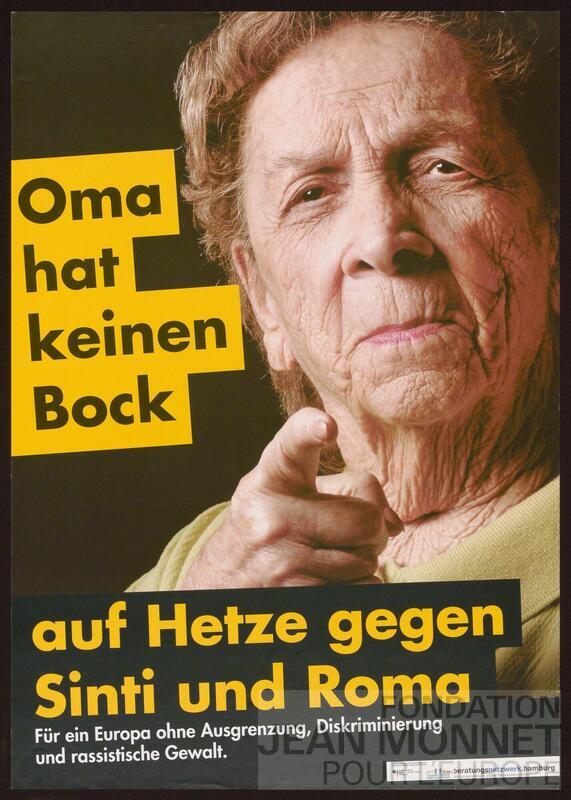 Affiche du réseau de conseil d'Hambourg (beratungsnetzwerk.hamburg). La date retenue est incertaine et correspond à la mention de l'affiche sur le fil du réseau Twitter/X du site d'actualités Der Freitag (source: https://x.com/derfreitag/status/468738424665829376) ainsi que du fil Facebook de Der Freitag (source : https://www.facebook.com/derfreitag/photos/oma-hat-keinen-bock-auf-hetze-gegen-sinti-und-roma___via-storch-heinar/10152450586927922/)