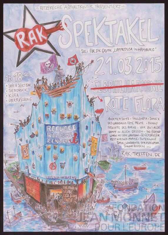 L'affiche présente le dessin d'un bâtiment au bord de l'eau sur lequel est écrit "refugee welcome center". Dans ce bâtiment on peut voir des musiciens. L'affiche présente également le dessin d'un bateau qui coule sur lequel est écrit "frontex".