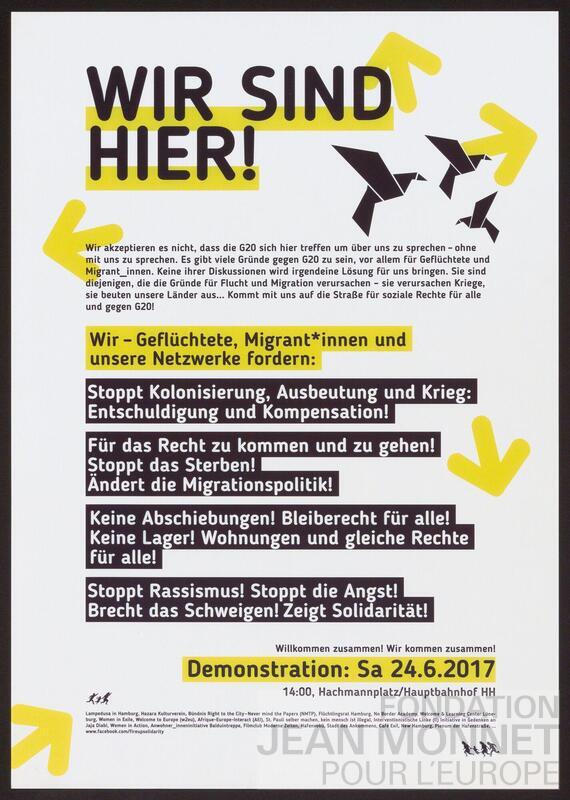 Affiche d'annonce de manifestation organisée par différents groupes qui viennent en aide aux réfugiés (Lampedusa in Hamurg, No Border Academy, etc.) ayant lieu le 24 juin 2017