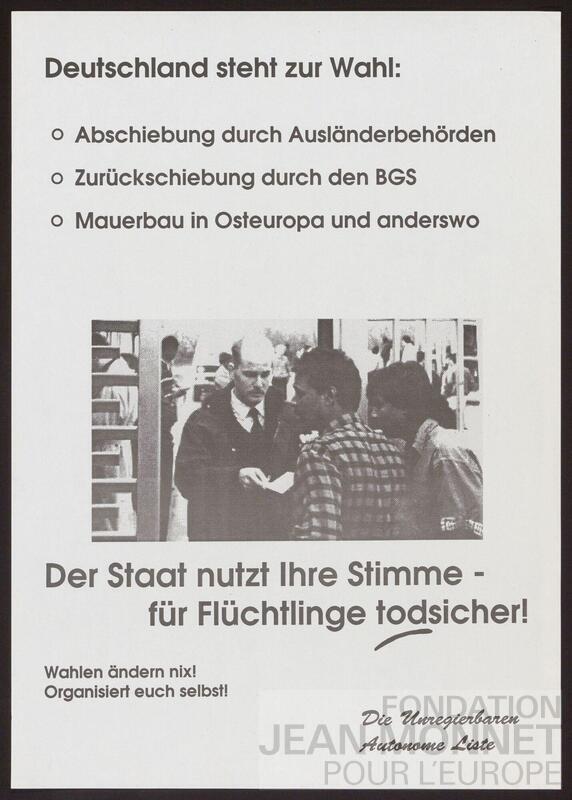 Affiche du parti politique allemand Autonome Liste à l'occasion des élections du Parlement européen de 1994, date retenue pour cette affiche (source: Wikipédia, consulté en ligne le 17 juillet 2025). On retrouve la même affiche avec un fond orange sous la cote C03-0208.