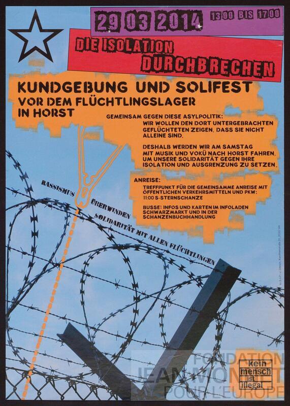 Affiche d'annonce du réseau académique mondial "kein Mensch ist illegal" à l'occasion d'un rassemblement et d'une Solifest (fête organisée dans le but de collecter des fonds ou de soutenir une cause solidaire, sociale ou politique, source: Wikipédia, consulté en ligne le 28 mai 2025) ayant lieu le 29 mars 2015 devant le camp de réfugiés de Horst. On retrouve la même ligne graphique sur l'affiche C03-0215. Responsable au sens du droit de la presse (V.i.S.d.P en allemand): Olaf Lagermann