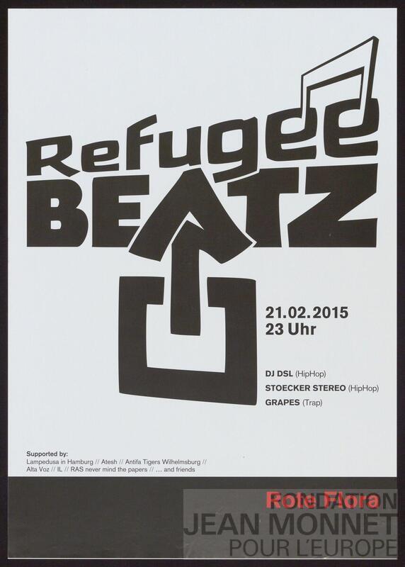 Affiche du collectif Rote Flora qui squatte un théâtre dans le quartier de Sternschanze à Hambourg en Allemagne depuis 1989 (source: Wikipédia, consulté en ligne le 21 juillet 2025). L'affiche annonce un concert organisé en faveur des réfugiés.