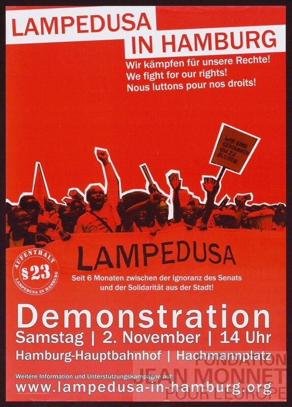 Affiche du groupe de 300 réfugiés Lampedusa in Hambourg qui a protesté pour un droit de séjour permanent (Wikipédia, consulté en ligne le 17 juillet 2025). La date retenue correspond à la date de manifestation annoncée sur l'affiche - le 02 novembre - complétée par la liste des différentes manifestations du mouvement Lampedusa in Hamburg présente sur Wikipédia (consulté en ligne le 24 juillet 2025)