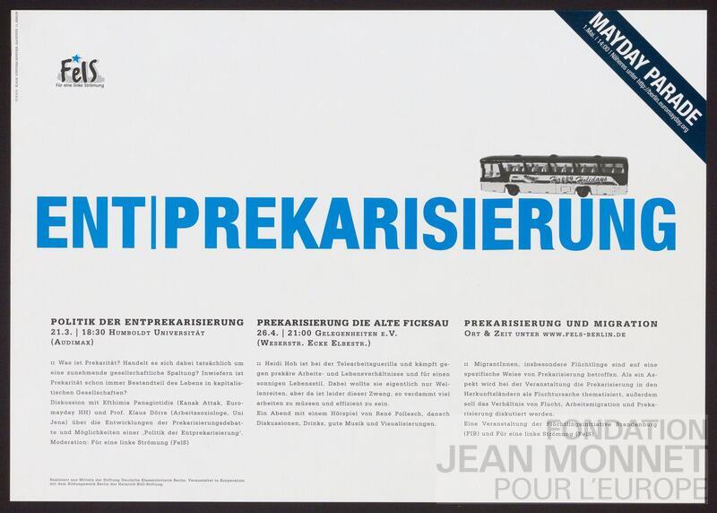 Affiche d'annonce d'une mayday parade pour lutter contre la précarisation. Responsable au sens du droit de la presse (V.i.S.d.P en allemand): Klaus Günther Eppstein. On trouve l'inscription "Realisiert aus Mitteln der Stiftung Deutsche Klassenlotterie Berlin, Veranstaltet in Kooperation mit dem Bildungswerk Berlin der Heinrich-Böll-Stiftung" en bas de l'affiche.