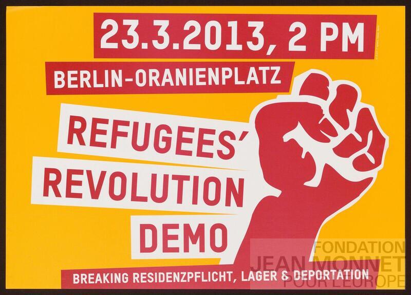 Affiche d'annonce de manifestation en lien avec la lutte pour les droits des réfugiés ayant lieu le 23 mars 2013 à Berlin