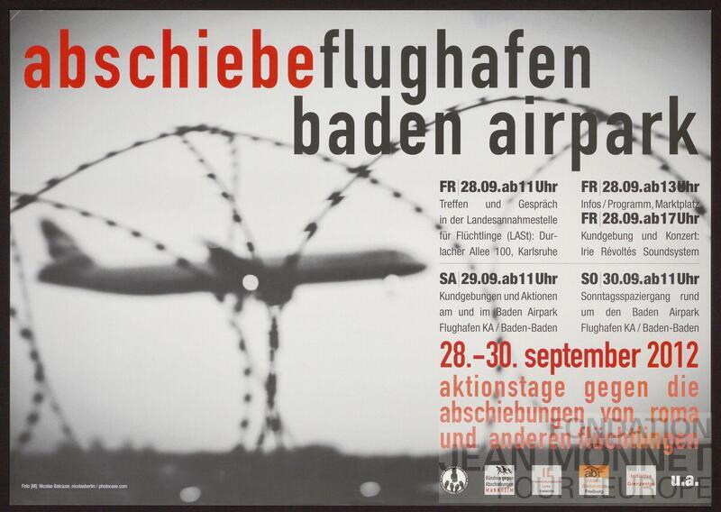 Affiche d'annonce de journées d'action contre l'expulsion de réfugiés ayant lieu du 28 au 30 septembre 2008 à l'aéroport de Baden. Source complémentaire: http://no-racism.net/article/4175/, consulté en ligne le 23 juillet 2025